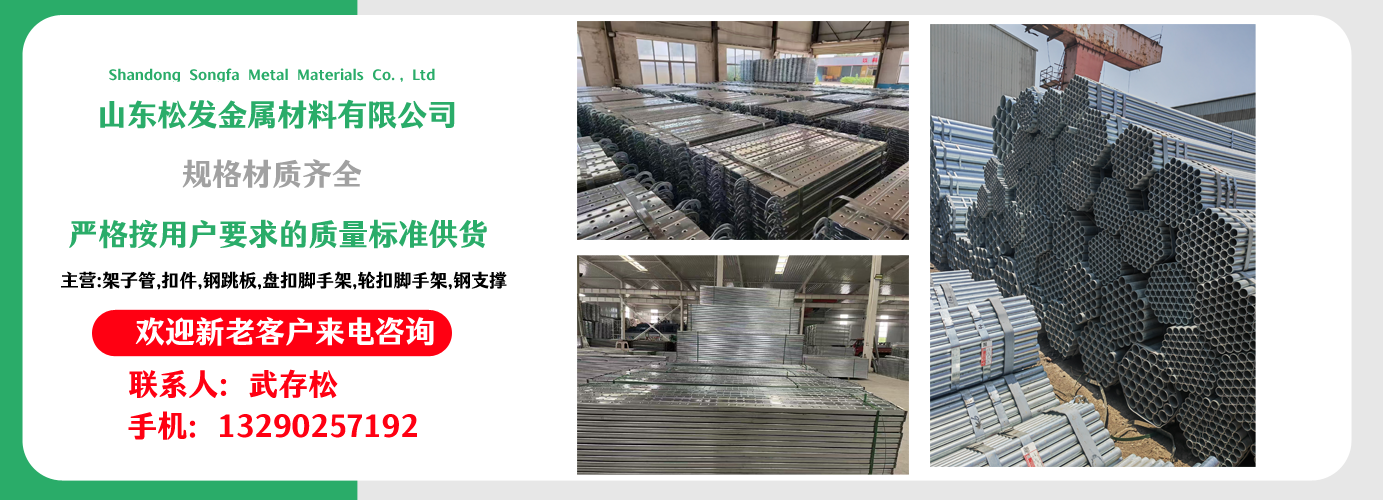 山東松發(fā)金屬材料有限公司主營(yíng)架子管,扣件,鋼跳板,盤扣腳手架,輪扣腳手架,鋼支撐生產(chǎn)廠家。本廠專業(yè)生產(chǎn)銷售。  建筑用架子管、 主要用于房建,橋梁,鐵路,公路,地鐵,水庫(kù),隧道,支撐。  架子管,扣件,鋼跳板,盤扣腳手架,輪扣腳手架,鋼支撐的優(yōu)越性及應(yīng)用“ ”產(chǎn)品因具有結(jié)構(gòu)簡(jiǎn)單合理、設(shè)計(jì)巧妙、使用方便、安全、快捷、易于運(yùn)輸、儲(chǔ)存、維護(hù)簡(jiǎn)單等特點(diǎn)。  公司一貫堅(jiān)持“質(zhì)量,用戶至上,優(yōu)質(zhì)服務(wù),信守合同”的宗旨,憑借著高質(zhì)量的產(chǎn)品,良好的信譽(yù),優(yōu)質(zhì)的服務(wù),產(chǎn)品暢銷全球。歡迎廣大客戶來(lái)電洽談,共同發(fā)展,共創(chuàng)輝煌!  山東松發(fā)金屬材料有限公司秉承誠(chéng)信服務(wù)、恪守信譽(yù)的宗旨,在同等的質(zhì)量下,保證以最低的價(jià)格,最完善的服務(wù),最高的信譽(yù)來(lái)答謝各界朋友的支持和厚愛(ài),歡迎您的來(lái)電、咨詢,我們將竭誠(chéng)為您服務(wù)!...